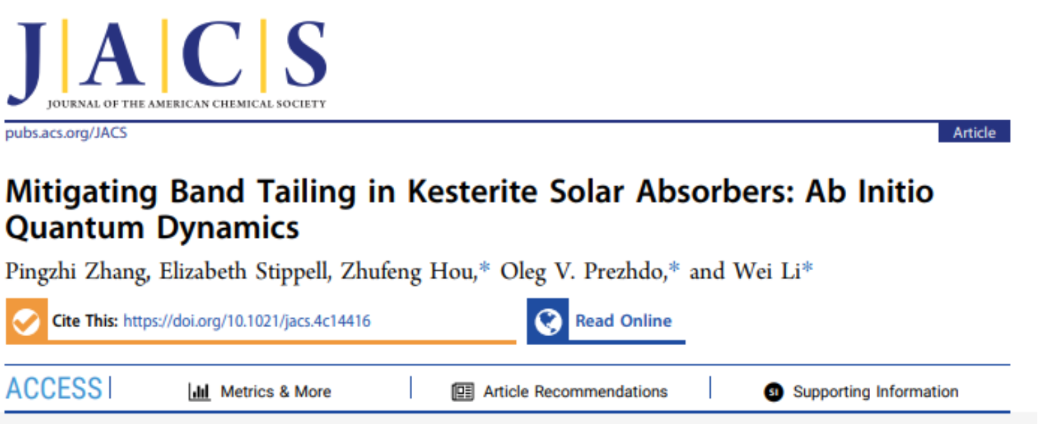 本网讯(化学与材料科学学院 周文)近日,化学与材料科学学院李位教授课题组在四元化合物半导体铜锌锡硫(CZTS)太阳能电池带尾效应的形成与消除机制研究中取得重要进展。相关研究成果以“Mitigating Band Tailing in Kesterite Solar Absorbers: Ab Initio Quantum Dynamics”为题在线发表于国际化学领域顶级期刊《Journal of the American Chemical Society》(JACS,中文名称:《美国化学会志》,美国化学会旗舰期刊,中国科学院一区top,最新影响因子:14.5)。化材学院2023级硕士研究生张平治为第一作者,李位教授、中国科学院福建物构所侯柱锋副研究员和美国南加州大学的Oleg V. Prezhdo教授为共同通讯作者,vwin德赢ac米兰官方网为第一完成单位。
