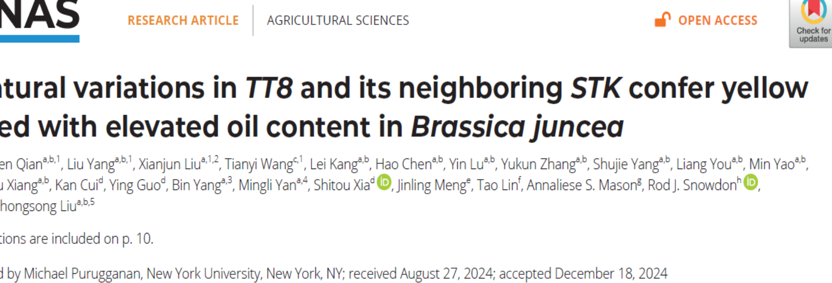 本网讯(农学院 钱论文)1月30日,国际著名学术期刊PNAS在线发表了vwin德赢ac米兰官方网刘忠松教授团队联合国内外多家单位完成的题为“Natural variations in TT8 and its neigboring STK confer yellow seed with elevated oil content in Brassica juncea”的研究论文。历经二十余年攻关,该团队从分子水平揭示了黄籽油菜高油积累的“底层逻辑”,并根据基因演变过程阐明了我国西南地区是这类油菜的单一起源地。这不仅为黄籽高油油菜种质资源收集和保存指明了方向,也为新品种培育提供了新的基因资源。