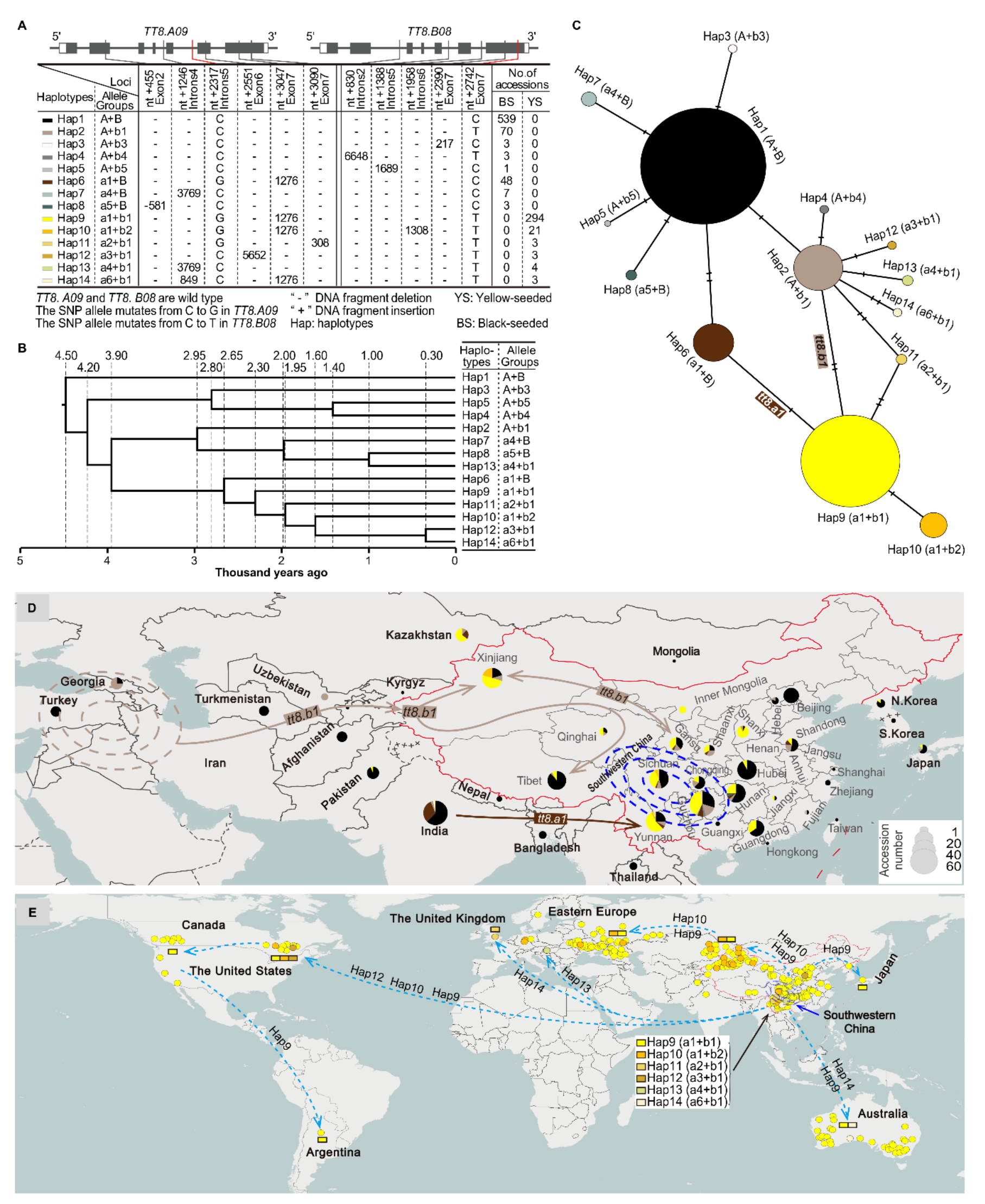 团队对全球1000余份种质TT8s基因进行了变异分析,发现有14种不同变异类型。通过计算不同变异类型的出现时间,并结合其地理分布,他们阐明了芥菜型黄籽油菜在大约2300年前起源于中国西南地区。