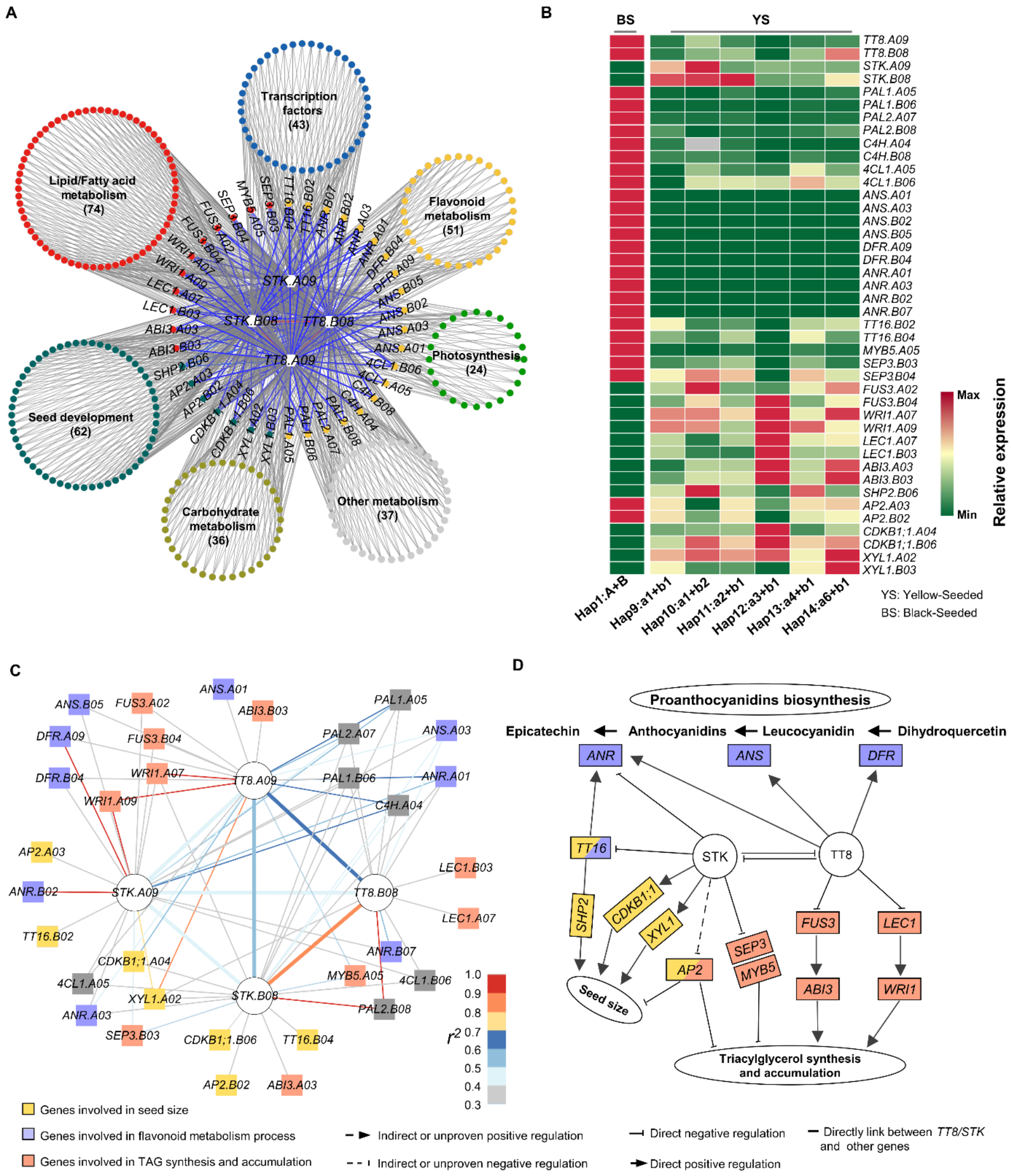 此外,团队在多环境中种植了重测序的芥菜种质,测定它们的含油量、粒重和皮壳率等性状。通过全基因组关联分析,他们发现了另一个显著关联的基因STKs,并证实它与TT8s基因协同调控了黄籽油菜的种子颜色、低皮壳率和高油分积累,进一步揭示了黄籽油菜高油积累的分子基础。