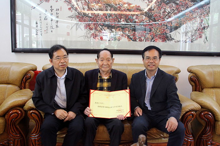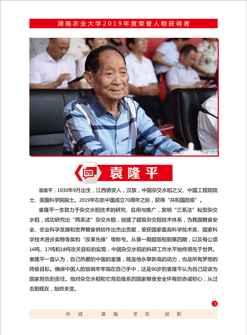 摄影|熊赳2020年9月28日,校长邹学校院士向共和国勋章获得者、杰出科学家袁隆平院士颁发了名誉校长聘书,党委书记陈弘教授主持聘任仪式,代表全校师生向袁隆平院士表示衷心感谢和崇高敬意,祝福袁隆平院士身体健康,中秋国庆快乐。袁隆平在仪式上高兴地说:“今年中秋国庆同一天,真是千载难逢的好日子。我非常荣幸担任湖南农大的名誉校长。农业现代化、粮食安全关键在科技、在人才,农业大学要多培养懂农业、爱农村的优秀人才,多出能解决实际问题、发展农业产业、帮助农民富裕的科技成果。”袁隆平(1930.9.7- )出生于北平,1953年毕业于西南农学院。1964年开始研究杂交水稻,1973年实现三系配套,1974年育成第一个杂交水稻强优组合南优2号,1975年研制成功杂交水稻制种技术,从而为大面积推广杂交水稻奠定了基础。1985年提出杂交水稻育种的战略设想,为杂交水稻的进一步发展指明了方向。1987年任863计划两系杂交稻专题的责任专家,1995年研制成功两系杂交水稻,1997年提出超级杂交稻育种技术路线,2000年实现了农业部制定的中国超级稻育种的第一期目标,2004年提前一年实现了超级稻第二期目标。1995年当选为中国工程院院士。先后获得“国家特等发明奖”、“首届最高科学技术奖”等多项国内奖项和联合国“科学奖”、“沃尔夫奖”、“世界粮食奖”等11项国际大奖。出版中、英文专著6部,发表论文60余篇。