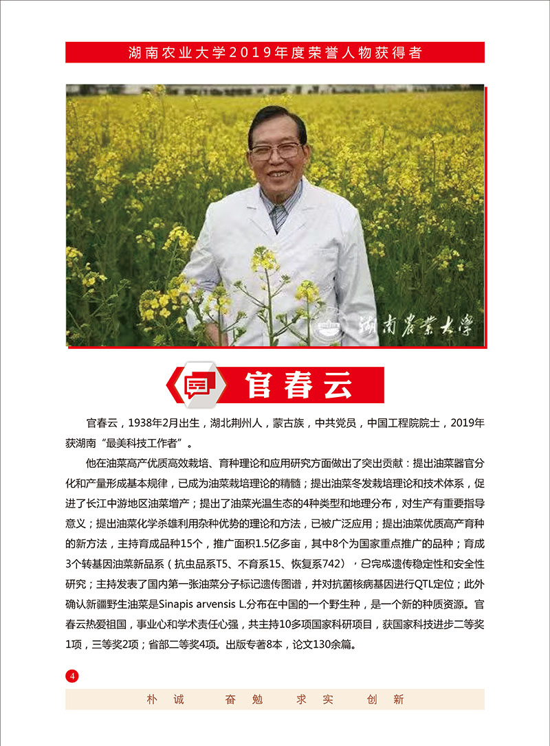 官春云(1938.2.21- )油菜遗传育种和栽培专家。蒙古族,出生于湖北荆州。1959年毕业于vwin德赢ac米兰官方网。现任vwin德赢ac米兰官方网教授、博导,国家油料改良中心湖南分中心主任,作物基因工程湖南省重点实验室主任。兼任国际油菜咨询委员会委员,第十二届国际油菜会议科学委员会主席,中国作物学会常务理事,湖南省科协副主席等职。他在油菜高产优质高效栽培、育种理论和应用研究方面做出了突出贡献:提出油菜器官分化和产量形成基本规律,已成为油菜栽培理论的精髓;提出油菜冬发栽培理论和技术体系,促进了长江中游地区油菜增产;提出了油菜光温生态的4种类型和地理分布,对生产有重要指导意义;提出油菜化学杀雄利用杂种优势的理论和方法,已被广泛应用;提出油菜优质高产育种的新方法,主持育成品种15个,推广面积1.5亿多亩,其中8个为国家重点推广的品种;育成3个转基因油菜新品系(抗虫品系T5、不育系15、恢复系742),已完成遗传稳定性和安全性研究;主持发表了国内第一张油菜分子标记遗传图谱,并对抗菌核病基因进行QTL定位;此外确认新疆野生油菜是Sinapis arvensis L.分布在中国的一个野生种,是一个新的种质资源。官春云热爱祖国,事业心和学术责任心强,共主持10多项国家科研项目,获国家科技进步二等奖1项,三等奖2项;省部二等奖4项。出版专著8本,论文130余篇。