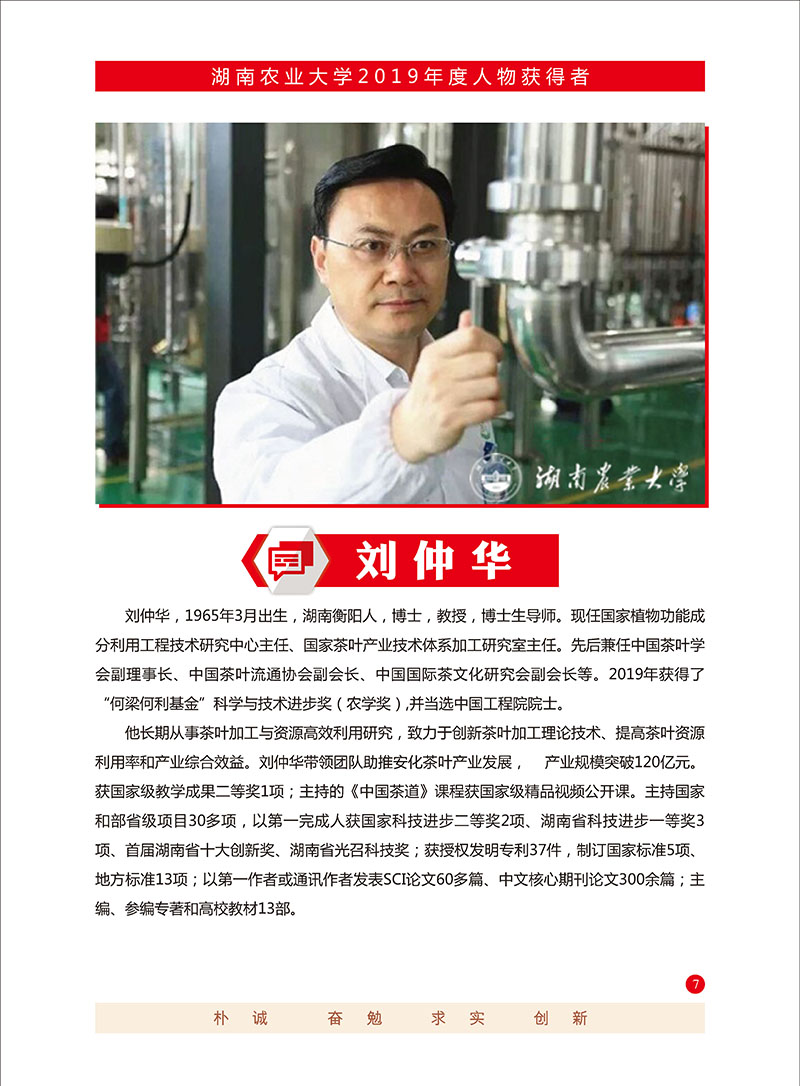 刘仲华(1965.3.14- ),男,茶学专家,湖南衡阳县人。1985年、1988年于湖南农学院茶学本科、硕士毕业,2014年获清华大学理学博士学位。现任vwin德赢ac米兰官方网教授、国家植物功能成分利用工程技术研究中心主任、国家茶叶产业技术体系加工研究室主任、vwin德赢ac米兰官方网茶学教育部重点实验室主任。