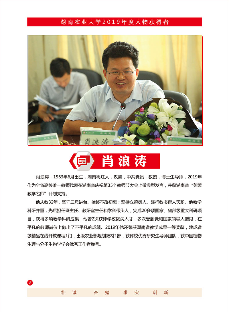 你笃定立德树人根本、坚持塑品行强能力勇担当,用真情、真诚、真爱走进学生的心灵,用实际行动引导学生知农爱农,陪伴与激励青年成长成才。你是“三农思政”的领跑者,是新时代“三全育人”的践行者。