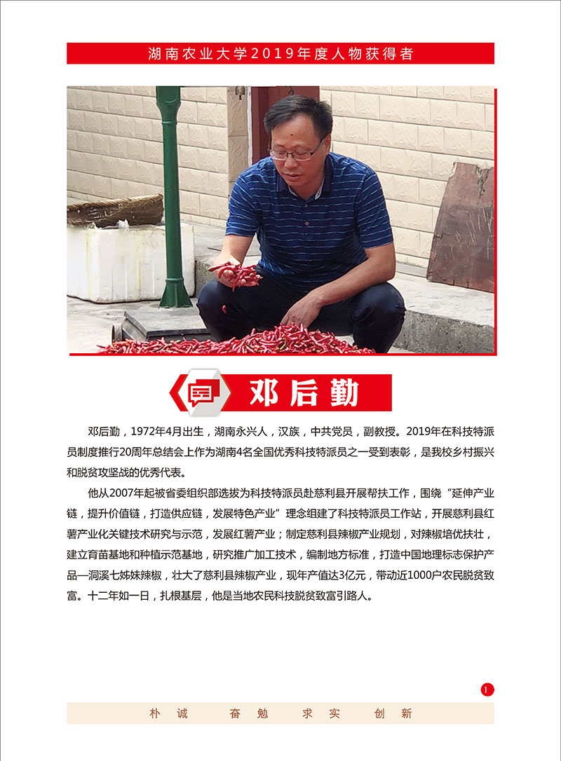 在国家精准扶贫期间,他担任湖南省脱贫攻坚考核第三方评估专家,带队完成了湖南省15个县(市、区)脱贫攻坚成效考核和贫困县退出第三方评估工作,并受国务院扶贫办委托,对湖北省、贵州省、河北省、广西壮族自治区等地区的国家贫困县退出进行第三方评估。他以强烈的政治自觉、扎实的专业素养、务实的行动彰显了德赢官网青年教师服务国家重大发展战略的责任和担当。通过带领学生参与评估,积极践行了学校师生服务“三农”理念,创新性地将思政教育、实践教学与社会服务紧密结合,扎实推动了“新农科”育人模式创新。